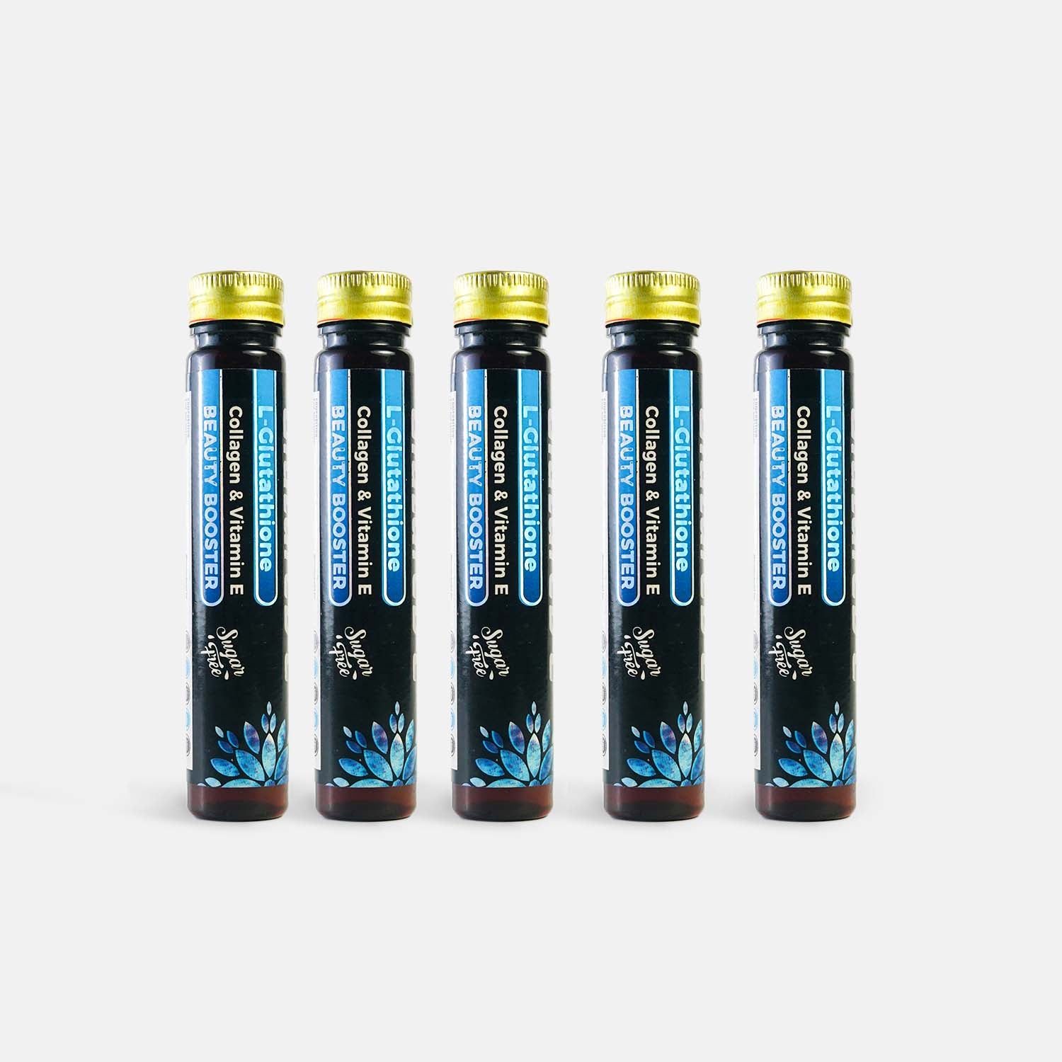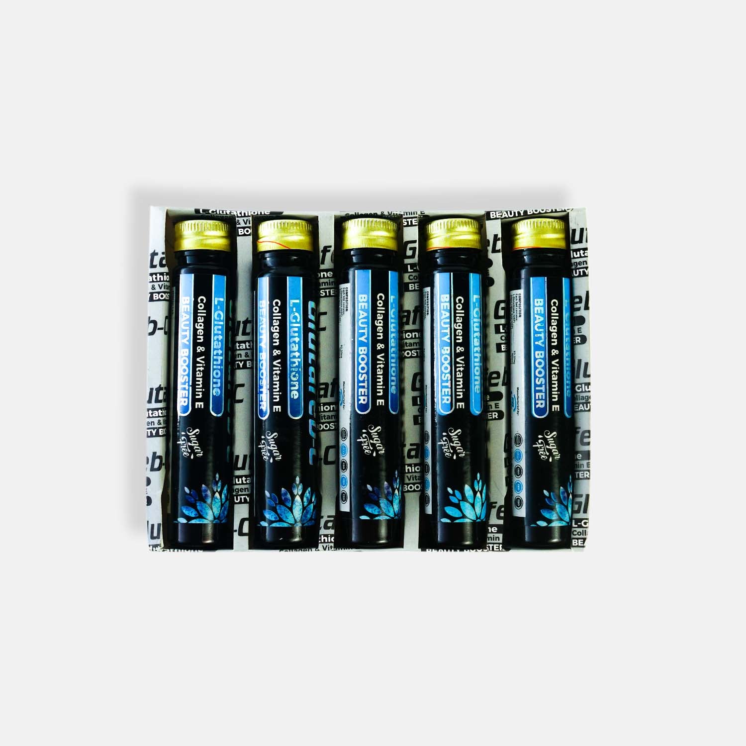 Our L-Glutathione Oral Shots come in a pack of 5, with each shot containing 30ml of a powerful formula enriched with collagen and Vitamin E. This master antioxidant has potent anti-aging properties, promoting a healthy glow while reducing sun spots, freckles, and hyperpigmentation for a clearer, more even complexion.